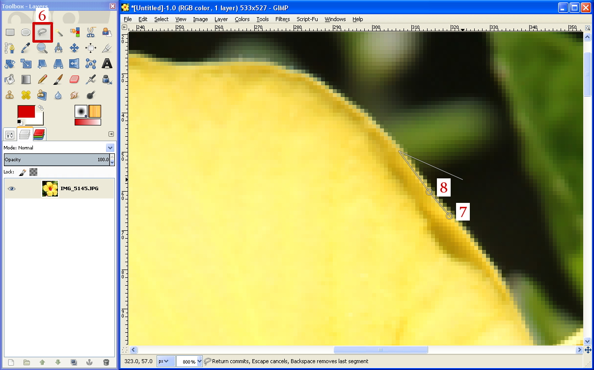 Choose the Free Select Tool (shortcut F) [6]. The final image will look best if you cut just to the inside of the edge of the flower so that there's no transition to the background color around the flower. Left-click at a spot on the edge of the flower [7], just inside where it changes from yellow to green. This will set a control point. Move your mouse a little along the edge and left-click again to set another control point [8]. Continue to set control points along the edge of the flower, using the mouse wheel and the CTRL and SHIFT keys to move the image as necessary. Notice that the control points seem to disappear as you move away from them. They will reappear as you move your mouse near them. If you don't like the position of a control point, you can click on it and move it. You can make the space between one control point and the next as close together or as far apart as you want. In general, if you're outlining a curve, you'll want the control points to be close together; and if you're moving along a straight edge, you can simply click at one end and then at the other.